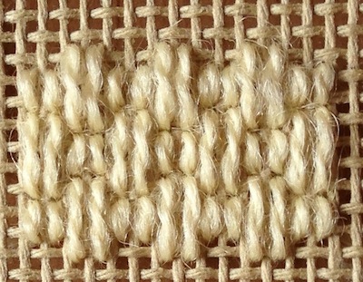Working the Encroaching Gobelin Stitch. For a stitch that is made up of such long threads Cross Tied Gobelin is quite hard-wearing. Makes a great coaster too.